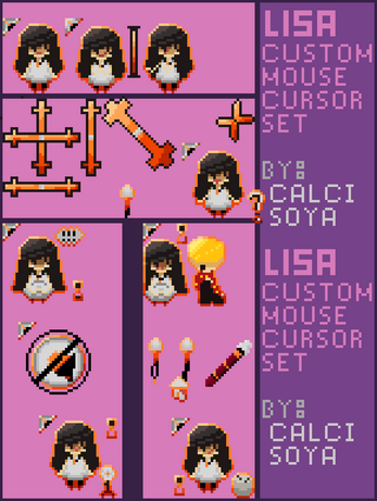 A custom mouse cursor set featuring Lisa Armstrong from the Lisa series of games, by Dingaling Productions. Sprites and animations were made by me (Calci Soya).